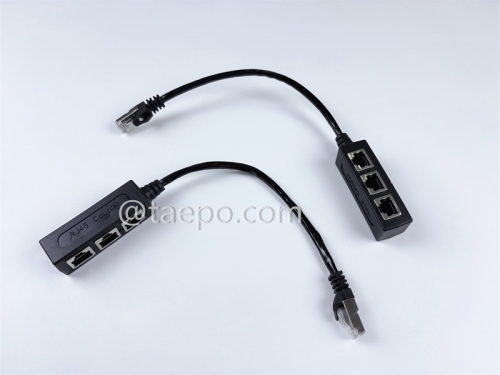 This is a RJ45 Coupler (TP-5233-3) designed to connect multiple Ethernet cables in a way that allows the signal from one cable to be distributed to several other cables. It is commonly used to extend the number of ports or connect multiple Ethernet cables into one network without the need for a switch or hub. This specific model appears to have 3 input ports and 1 output port.