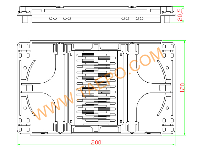 Fiber optic splice tray, 24 fibers, plastic, 200(L) x 121(W) x 24 (H)mm, with snap-in cover, without stud