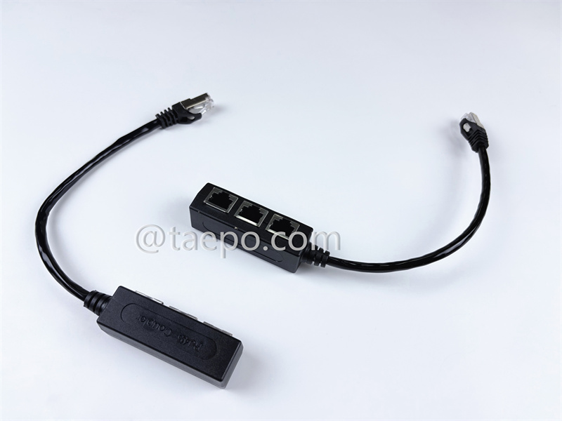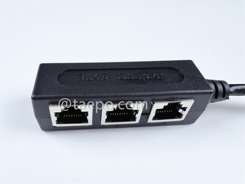 This is a RJ45 Coupler (TP-5233-3) designed to connect multiple Ethernet cables in a way that allows the signal from one cable to be distributed to several other cables. It is commonly used to extend the number of ports or connect multiple Ethernet cables into one network without the need for a switch or hub. This specific model appears to have 3 input ports and 1 output port.